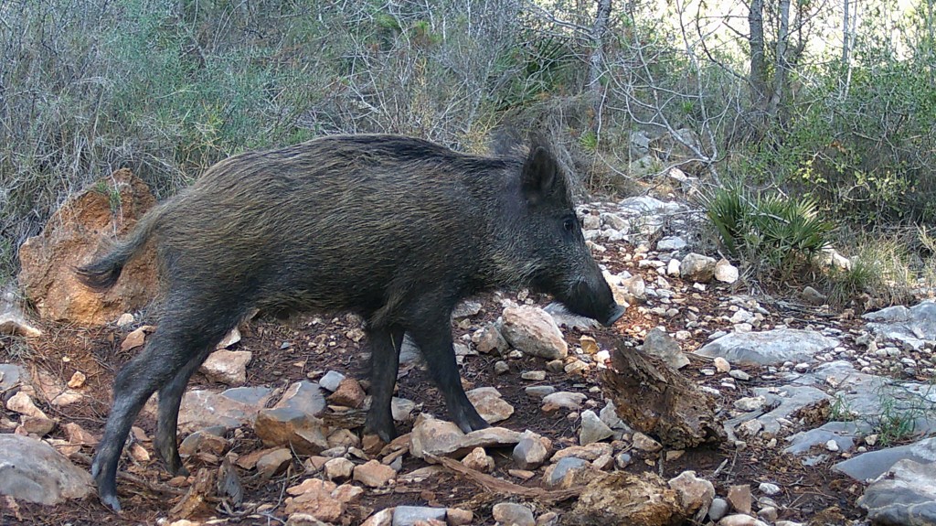 El tret més característic del senglar és el seu musell llarg i recte (Fotografia 1) que usen a mode d’excavadora per a trobar menjar, a més, tenen un olfacte extraordinàriament agut. Són omnívors i la seua dieta inclou fruits, arrels cucs, xicotets vertebrats, ous, carronya i fongs. Són d’hàbits crepusculars i nocturns (Fotografia 3).