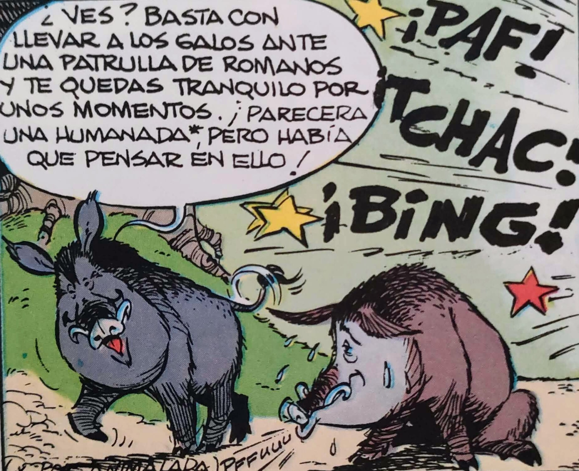 Este personatge secundari de “Les aventures de Asterix” és present en tots els banquets dels gals. En “L’odissea de Asterix” mostra una gran intel·ligència quan perseguits per Asterix, obelix e Idefix, fugen fins portar-los davant una patrulla de romans, i, com és de rigor, s’emboliquen a trompades els uns amb els altres, permetent als senglars escapar.