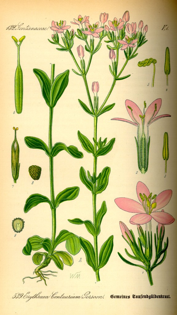 Hoy en día se la conoce como Centaurium erythraea nombre que proviene del griego kentaureios en referencia al centauro, ser mitológico mitad hombre y mitad caballo.